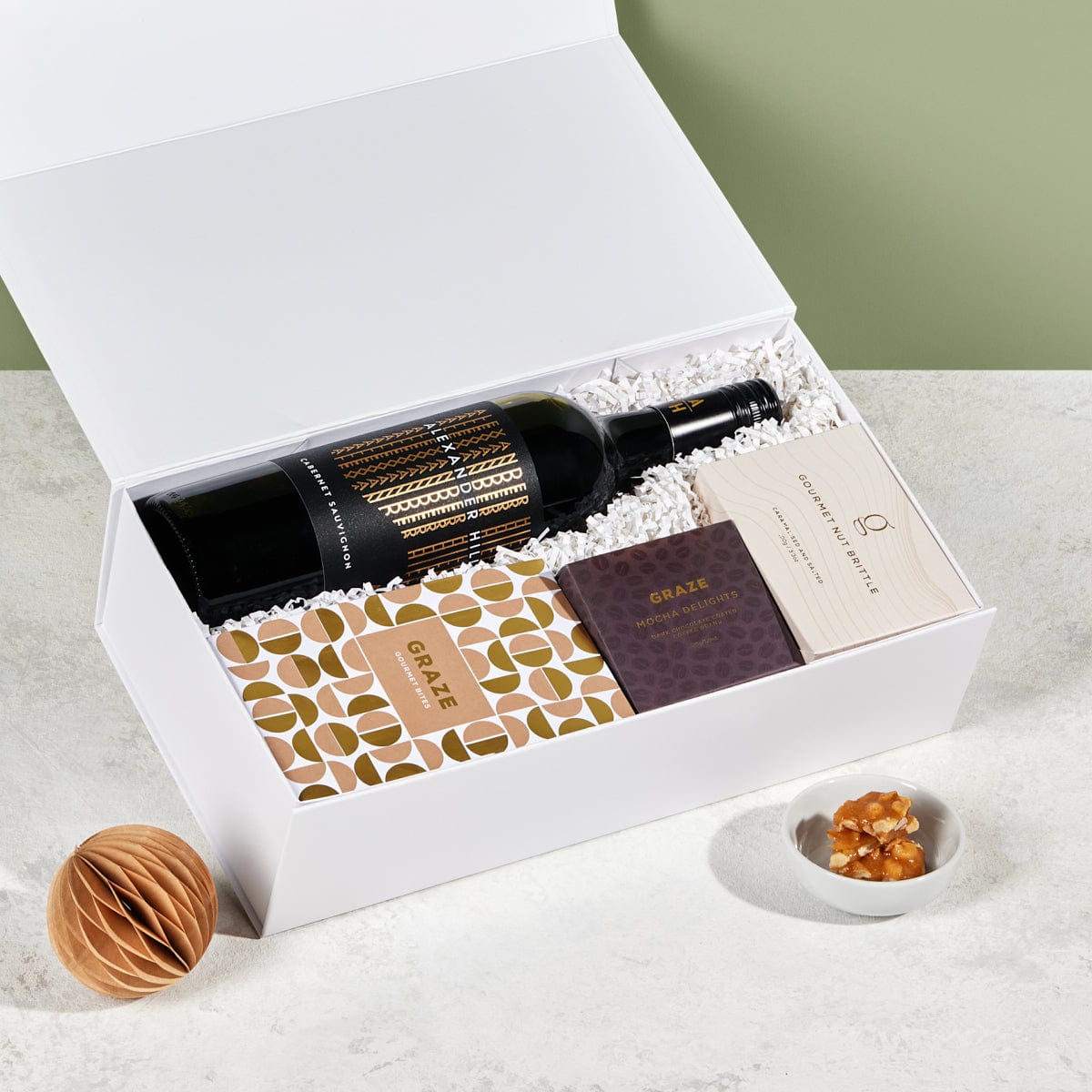 Savour the smooth depth of ALEXANDER HILL South East Aus 2021 Cabernet Sauvignon alongside a selection of sweet delights - crunchy Salted Caramel Peanut Brittle, Caramelised Honey Glazed Peanuts, and decadent Mocha Delight Dark Chocolate Coated Coffee Beans.