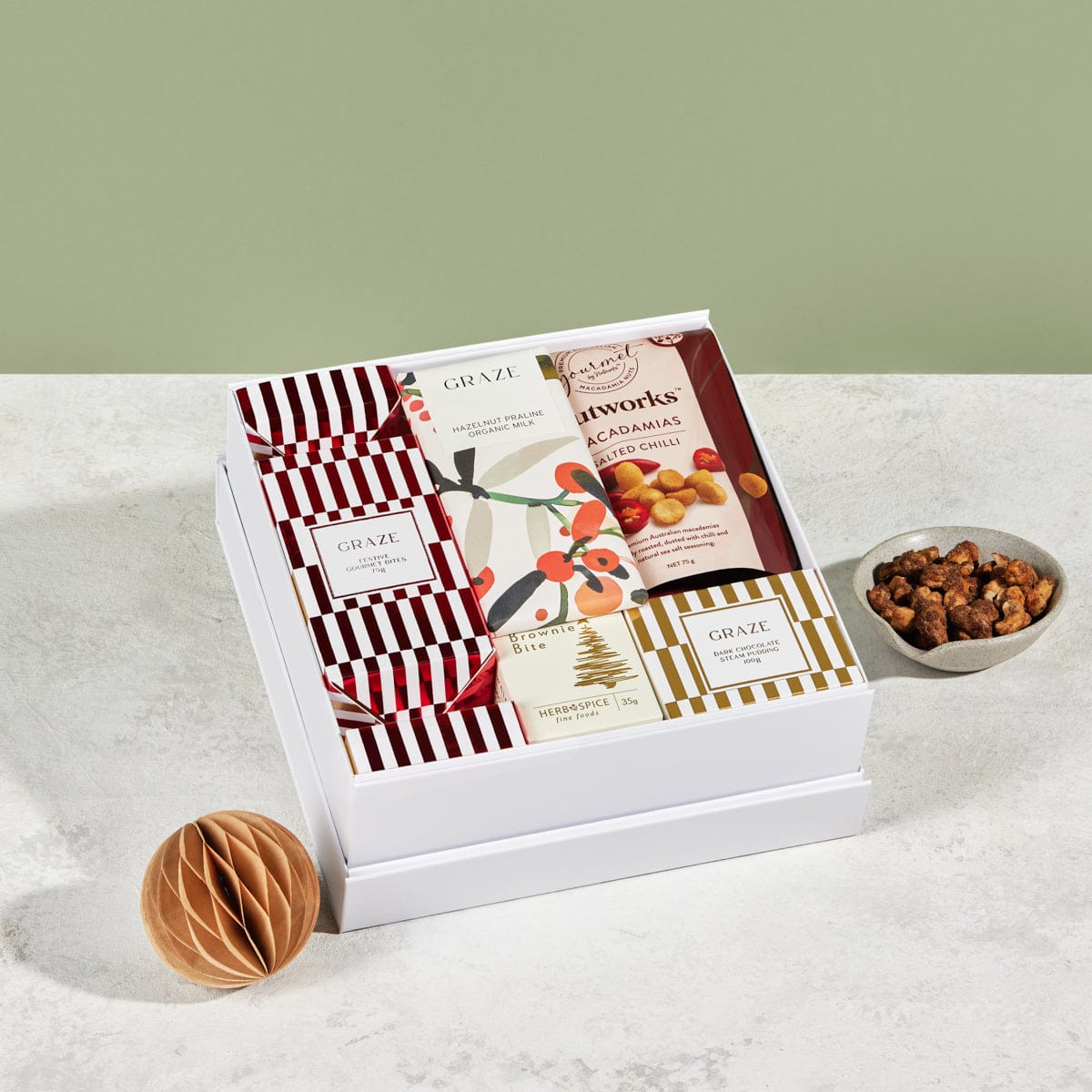 Satisfy every craving with a rich HERB & SPICE Brownie Bite, buttery Salted Caramel Nut Mix, and the bold kick of NUTWORKS Salted Chilli Macadamias. Enjoy the smooth GRAZE Praline Hazelnut Bliss Milk Chocolate Bar, savoury Smoked Salted Almonds, and festive Cinnamon Cashews tucked inside a joyful GRAZE Bon Bon.