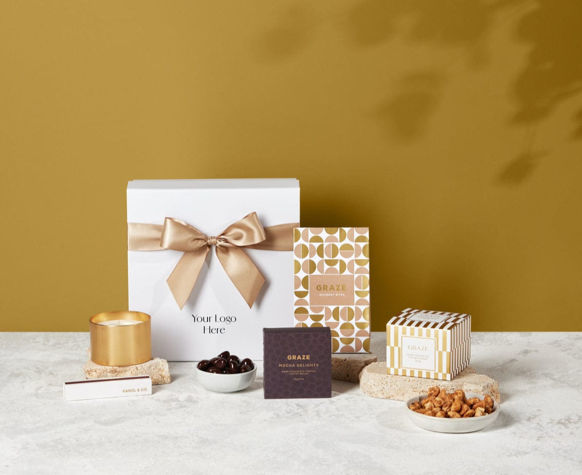 Light up any room with the soft flicker of the HORIZON Brushed Gold Soy Candle and savour rich delights like the velvety GRAZE Dark Chocolate Steam Pudding, decadent Mocha Delight Coffee Beans, and the sweet crunch of Caramelised Honey Glazed Peanuts.