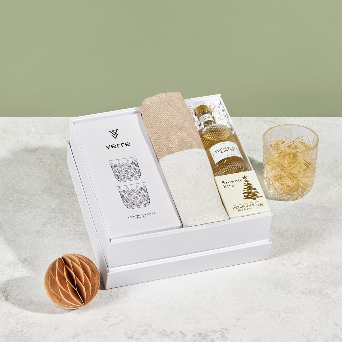 Enjoy the rich flavours of GRAZE Salted Caramel Peanut Brittle and a decadent HERB & SPICE Brownie Bite. Add a touch of everyday luxury with a soft, 100% Cotton Turkish Hand Towel in warm Beige.
