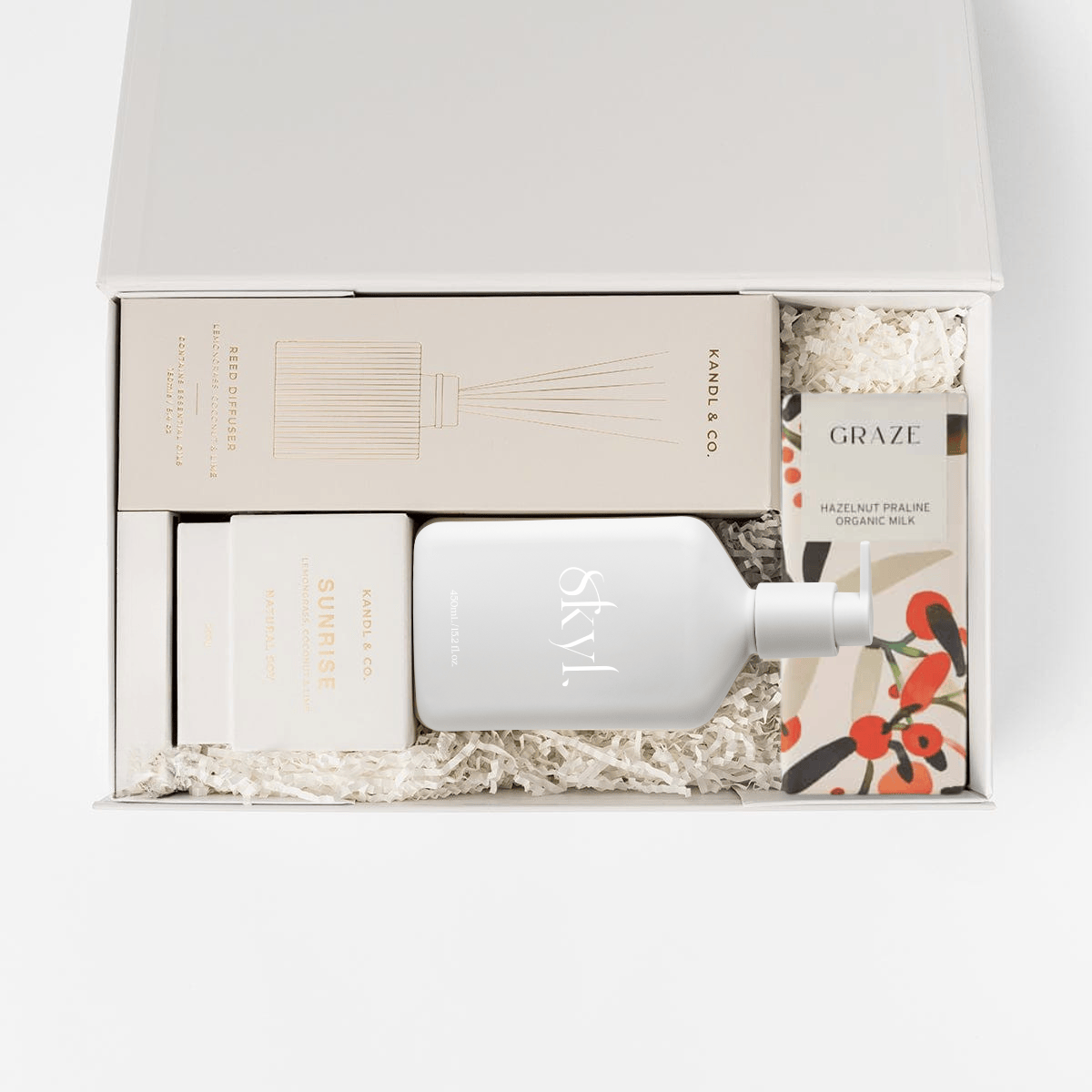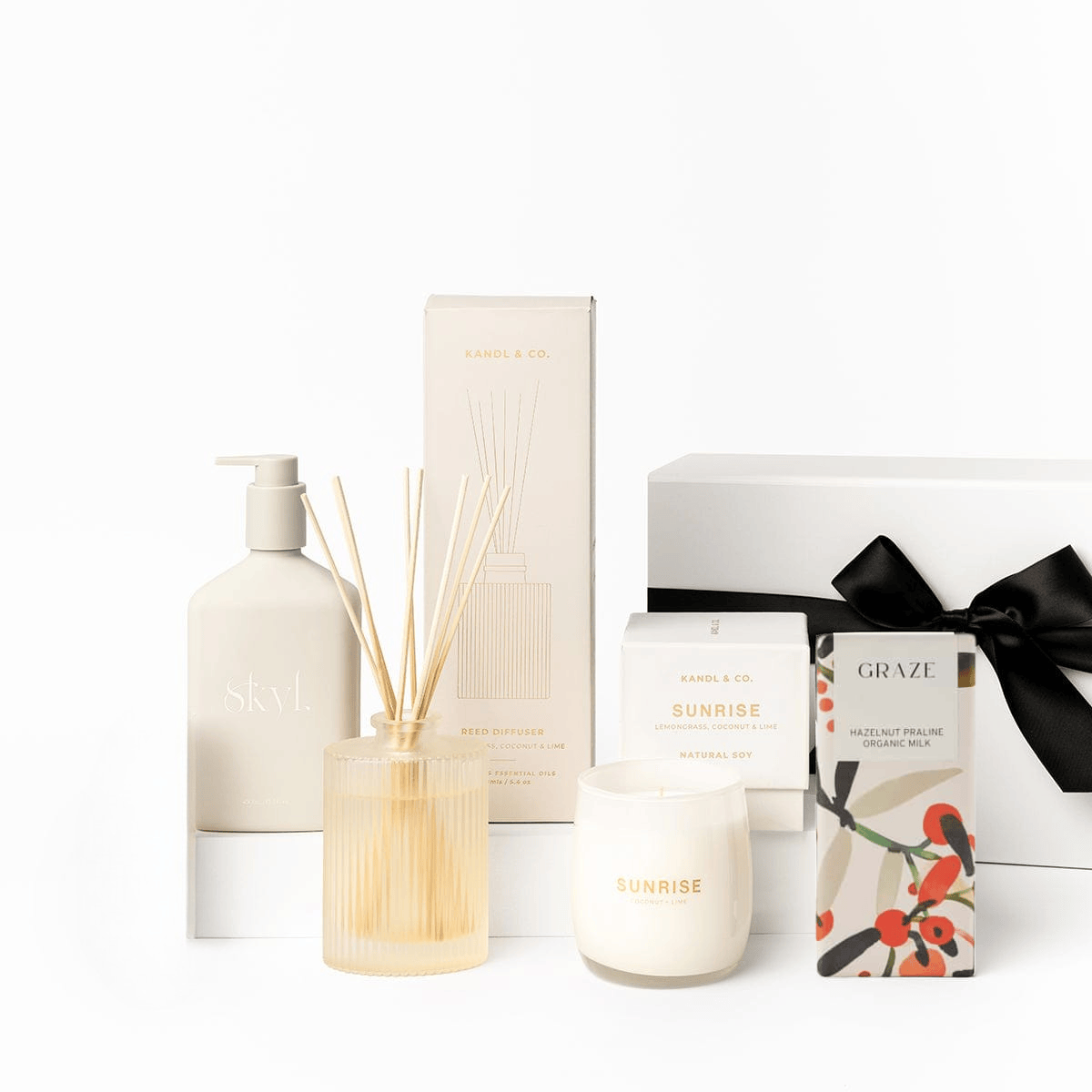 This elegant collection includes a KANDL & CO Coconut, Lemongrass & Lime Reed Diffuser for a refreshing ambience. Enhance their relaxation with a KANDL & CO Coconut & Lime Soy Candle that offers a 35-hour burn. The set also features SKYL Premium Soft Touch Hand Wash in invigorating Lemon, Lime & Grapefruit, and a delightful Bahen & Co Honey Macadamia Organic Milk Chocolate Bar.
