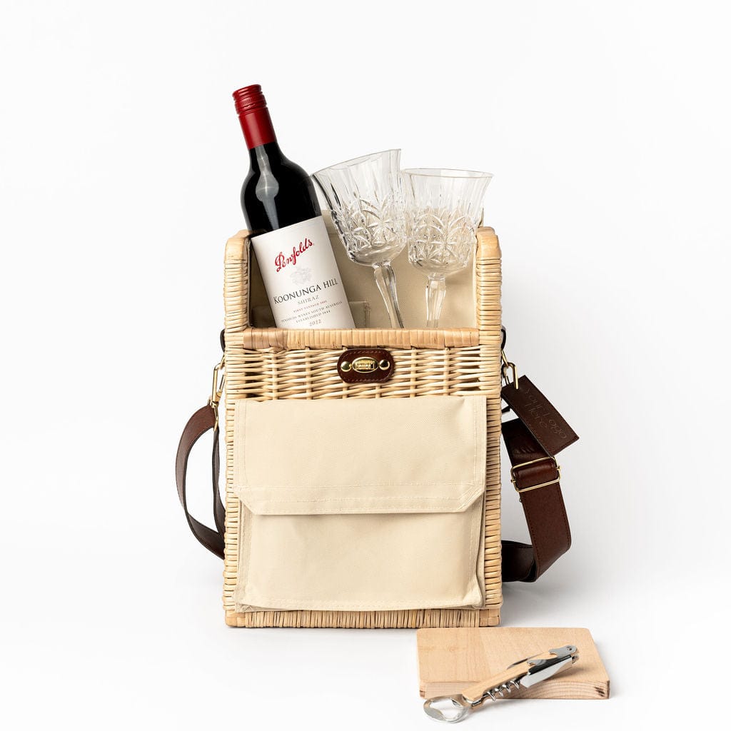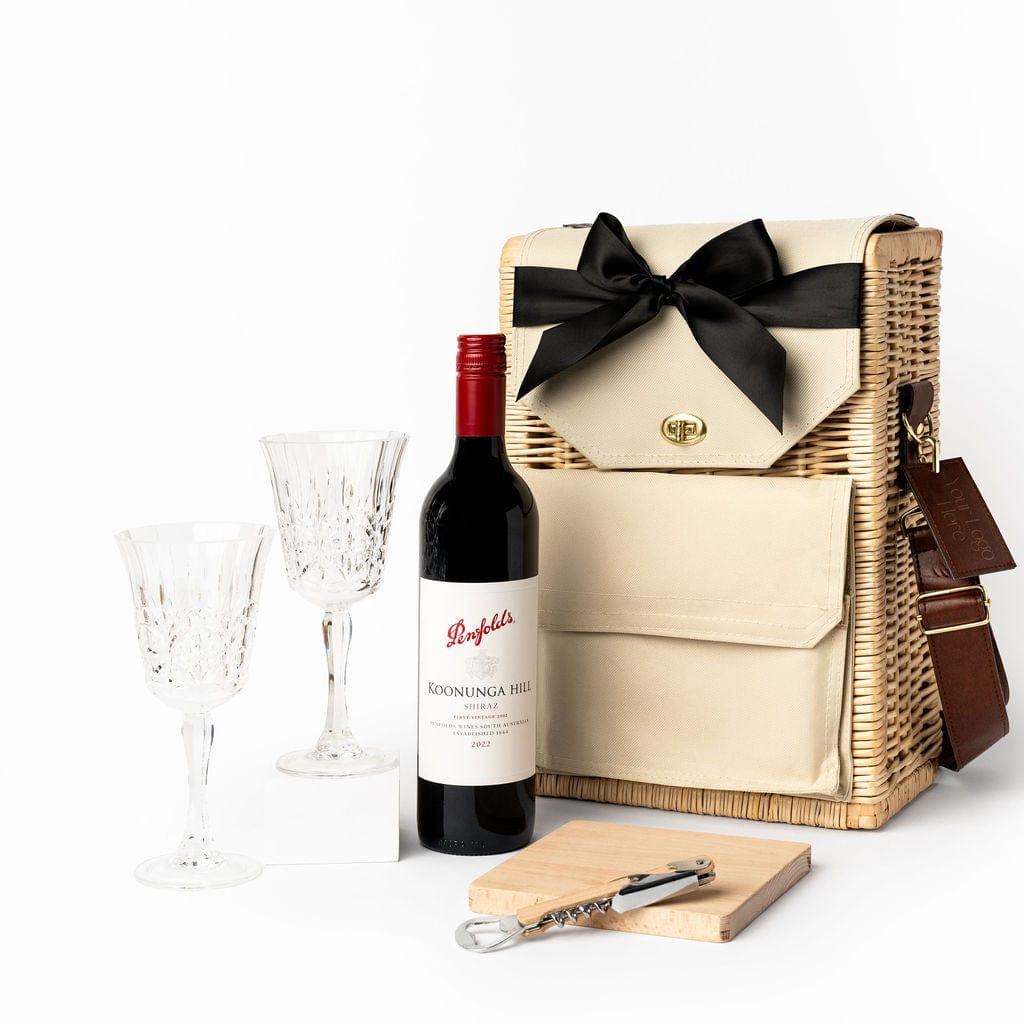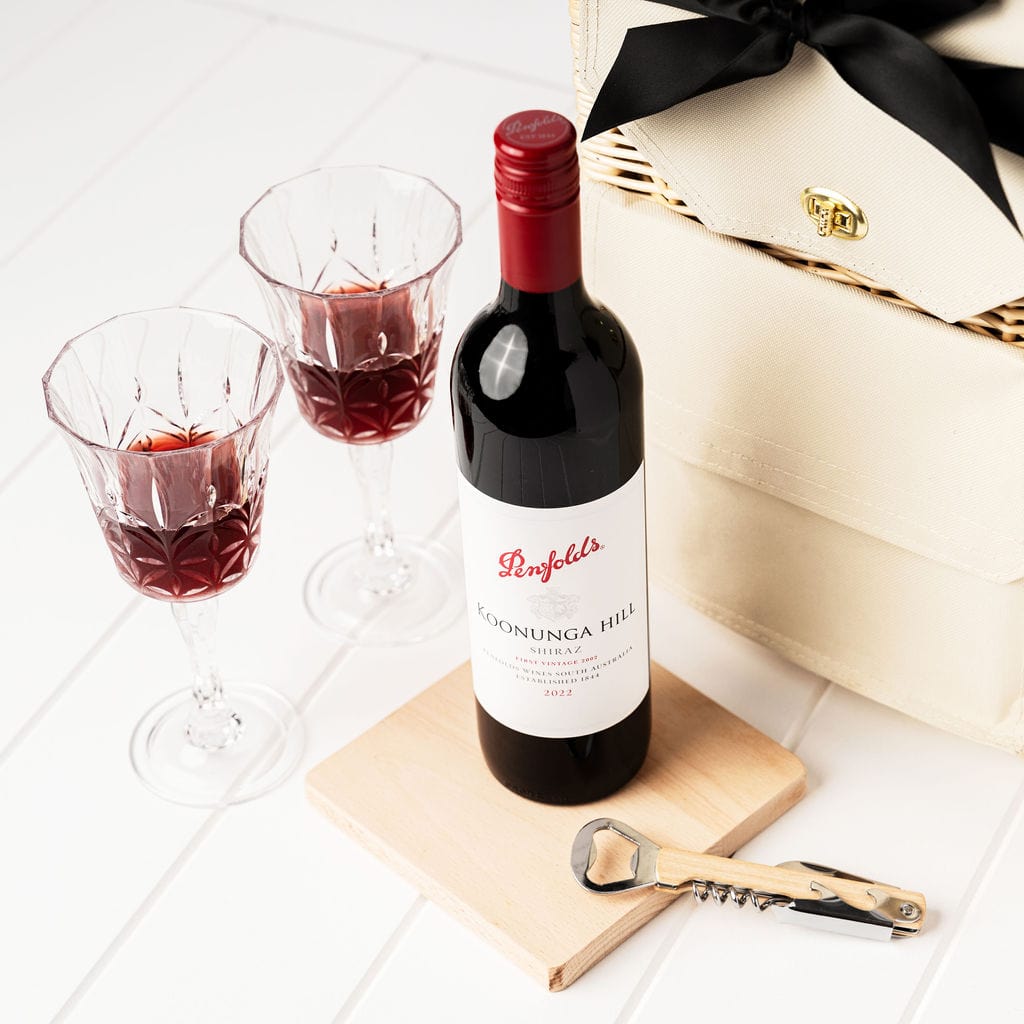 Introducing the Picnic On The Go, nestled within our Ellar Boutique Portable Picnic Carry Basket. Sip Penfolds Koonunga Hill Shiraz in style from our Acrylic Etched Wine Glasses. TheĀ Beech Wooden Serving Board and Bottle Opener are practical additions to ensure your recipients are prepared to enjoy a picnic wherever they go.Ā