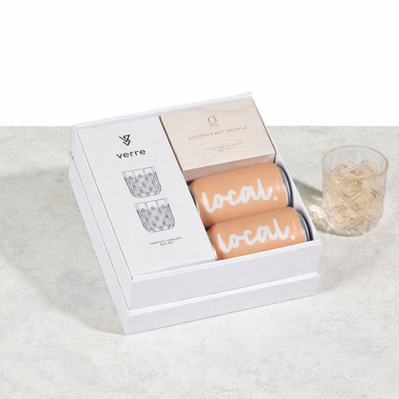 Delight in two crisp LOCAL Vodka Iced Tea Seltzers in Peach, served in elegant VERRE European etched tumblers, and finish with the irresistible sweet-salty crunch of GRAZE Salted Caramel Peanut Brittle.