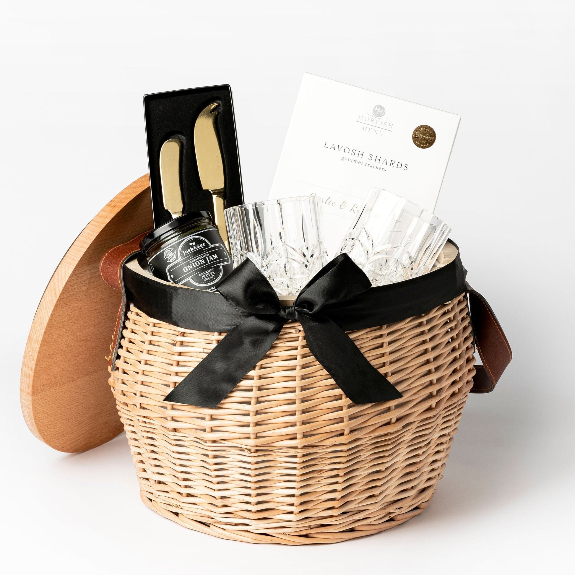 HOUSED in our premium insulated wicker picnic basket with wooden lid and leather look strap.Â