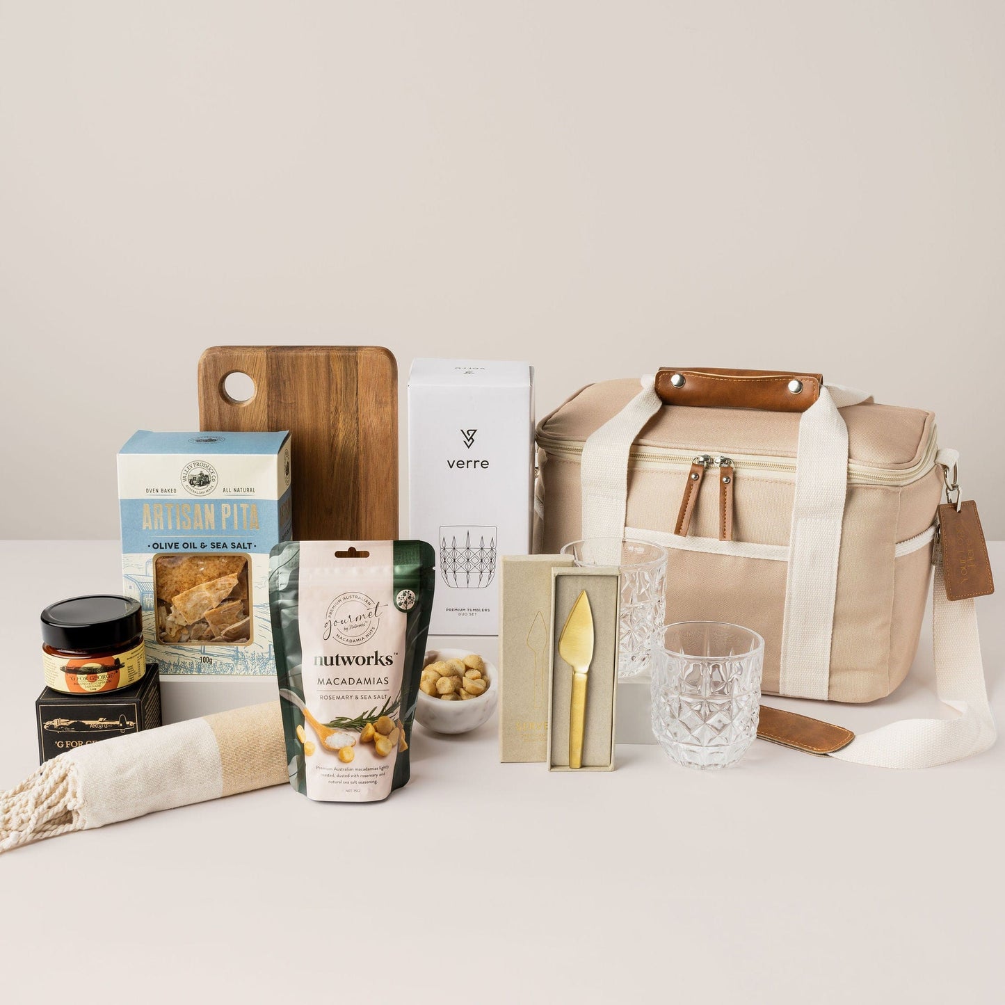 All presented on a beautiful Acacia Wooden Serving/Cheese Board and accompanied by a set of Verre European Etched Glass Tumblers. This gourmet collection is housed in our premium insulated Cooler Bag in Black or Taupe, which includes 4 external storage pockets, a shoulder strap, and a separate carry handle for easy transportation.