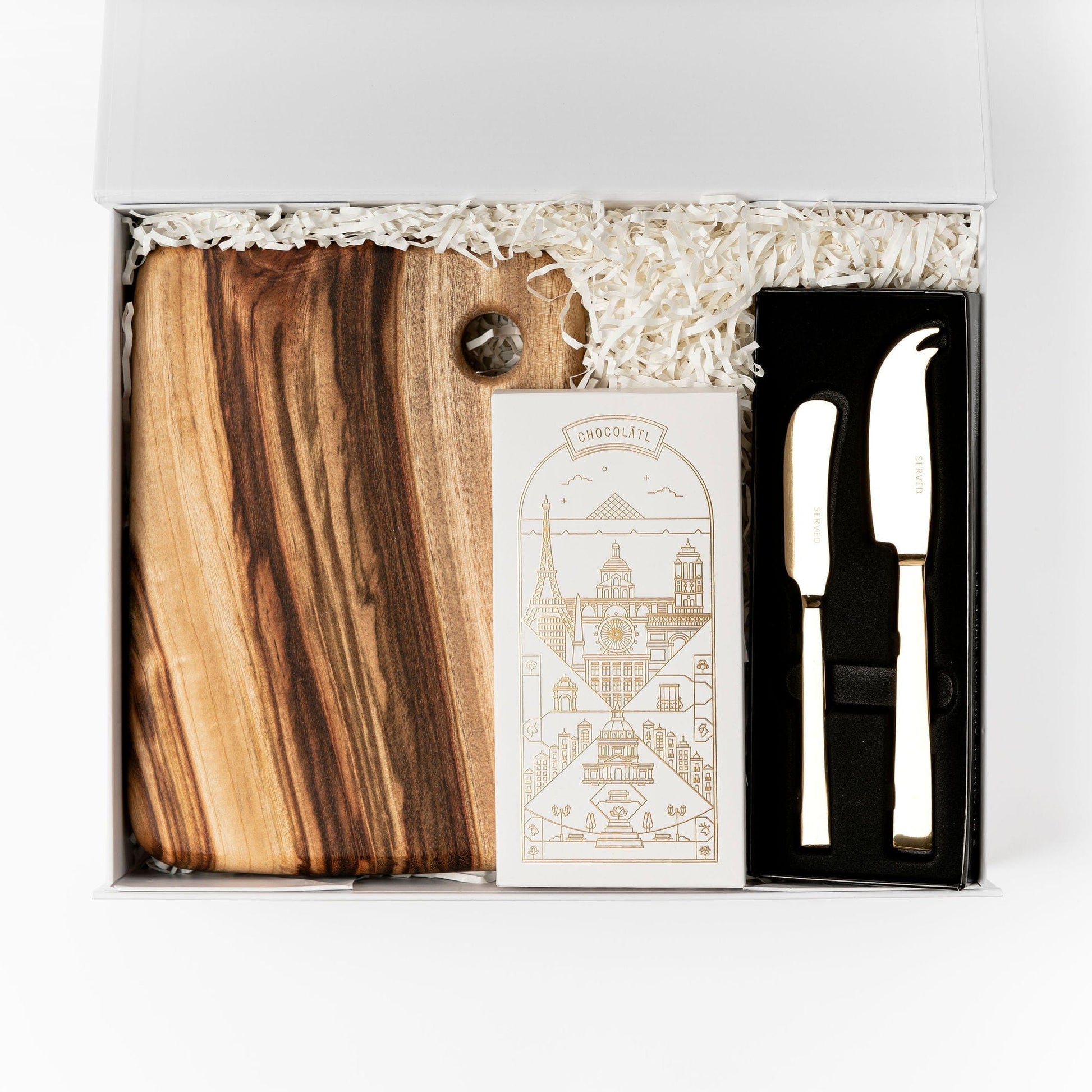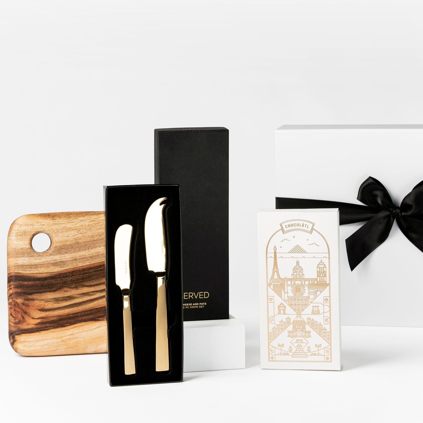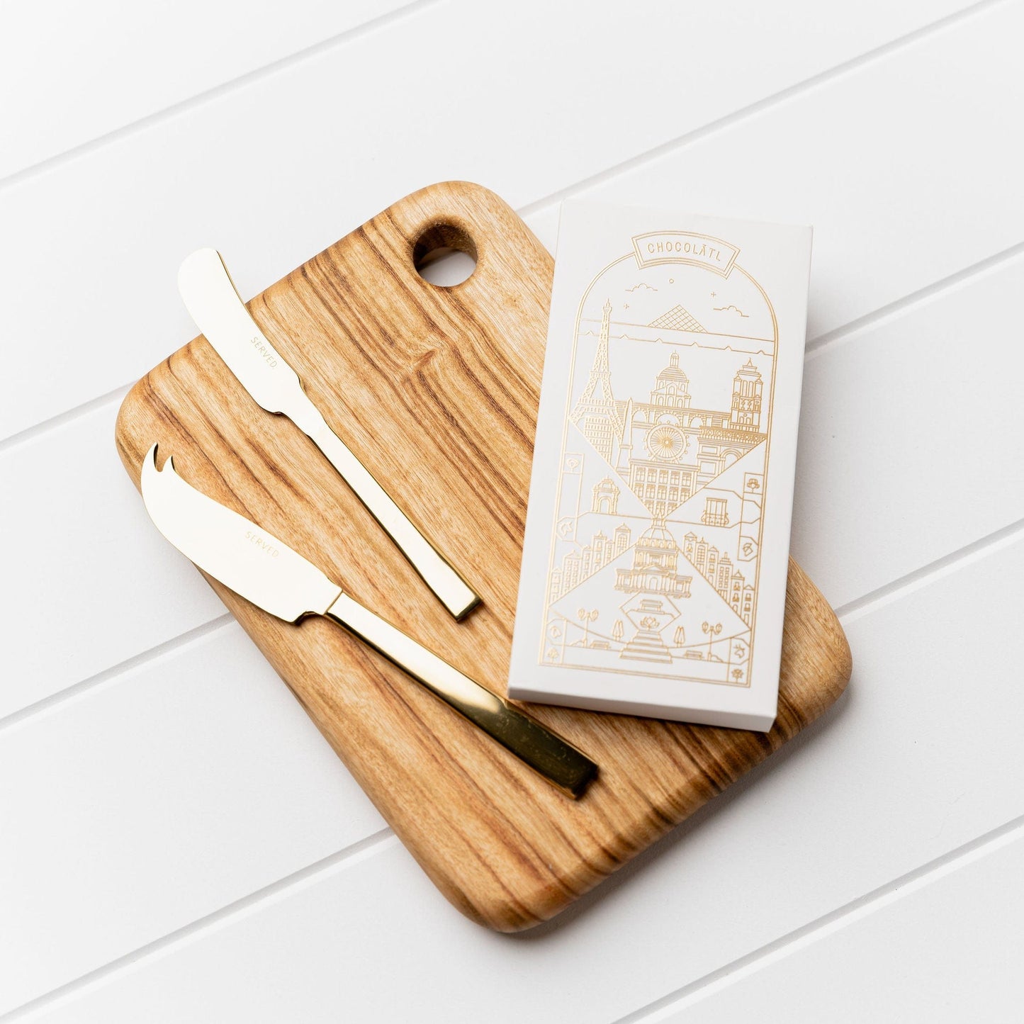 Inside this gift box will find a stunning Camphor Laurel Wooden Serving Board, a delicious premium chocolate bar and a set of our Served 2pc Cheese & Pate Knife Set.